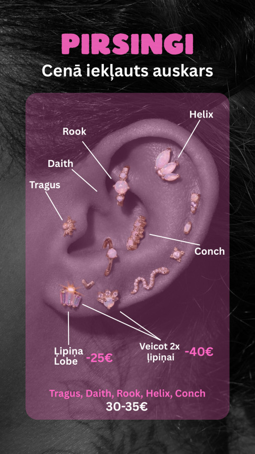 € 25-35Pīrsingu duršana (cena ar auskaru) • Ausu ļipiņa 1x 25€ • Durot uzreiz 2 ļipiņas par abiem 40€ • Skrimslī 30-35€ • Degunā 30€ • Nabā 35€ Ērta lokācija: Rīga, Elizabetes iela 75