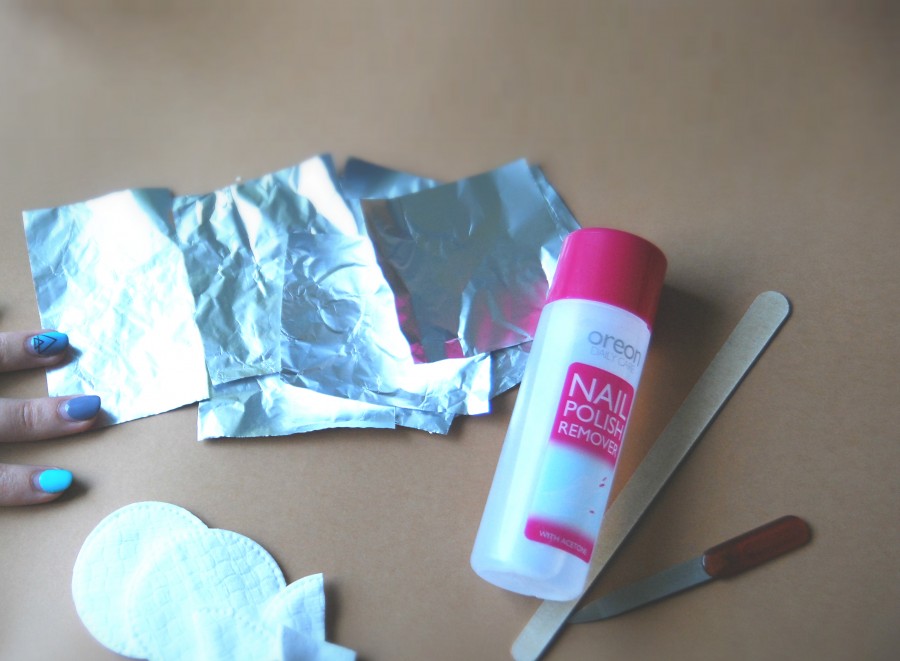 Gēllakas manikīru vienmēr veicu pie meistara, bet nagu lakas noņemšanu visbiežāk - mājās. Lai noņemtu gēllaku vajadzēs: acetonu saturošu nagu lakas noņēmēju, sagrieztas vates plāksnītes, folija loksnes ~8x8cm, nagu vīlī, koka irbulīti (vai manā gadījumā metāla nagu vīli).
