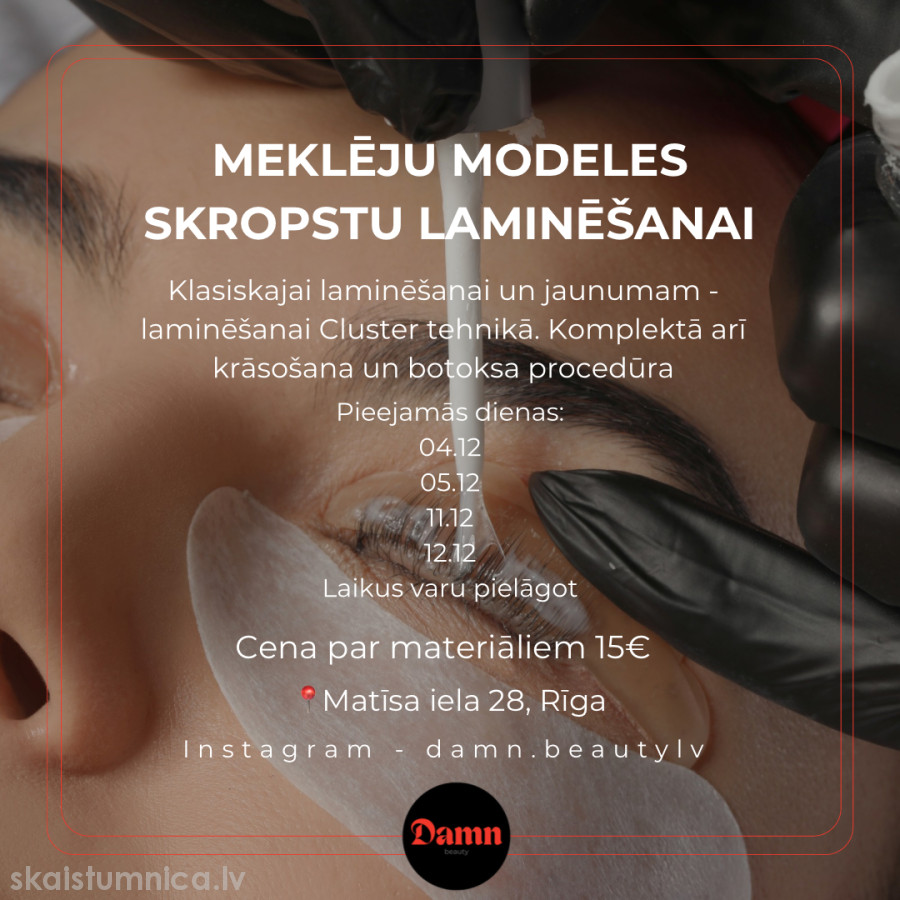 Portfolio papildināšanai ar bildēm un video meklēju modeles skropstu laminēšanai, krāsošanai un botoksa procedūrai