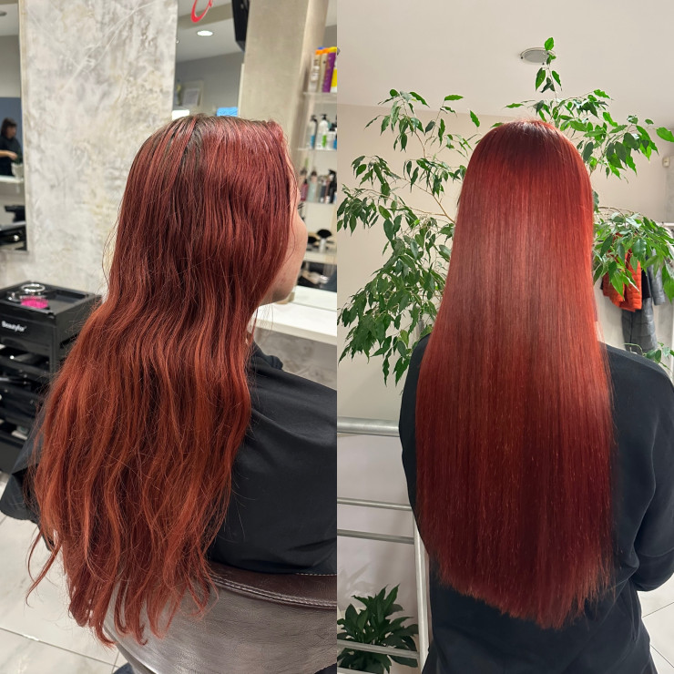 Atjaunojām saknes un atgriezām krāsai dzīvīgumu! ✨ No izbalējuša rudens? līdz intensīvi sarkanajam? – mati tagad izskatās veselīgi un spīdīgi.